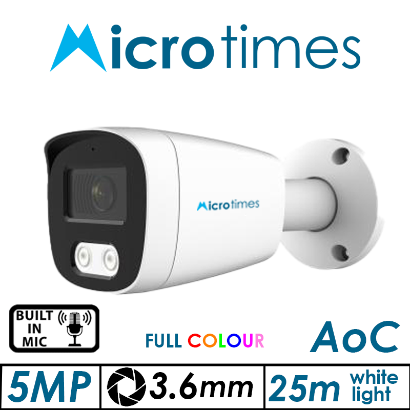 5MP MICROTIMES FULL COLOUR – HD FIXED BULLET HD ANALOGUE CAMERA WITH BUILT-IN MIC WHITE 3.6MM BLEXM500FCHDW