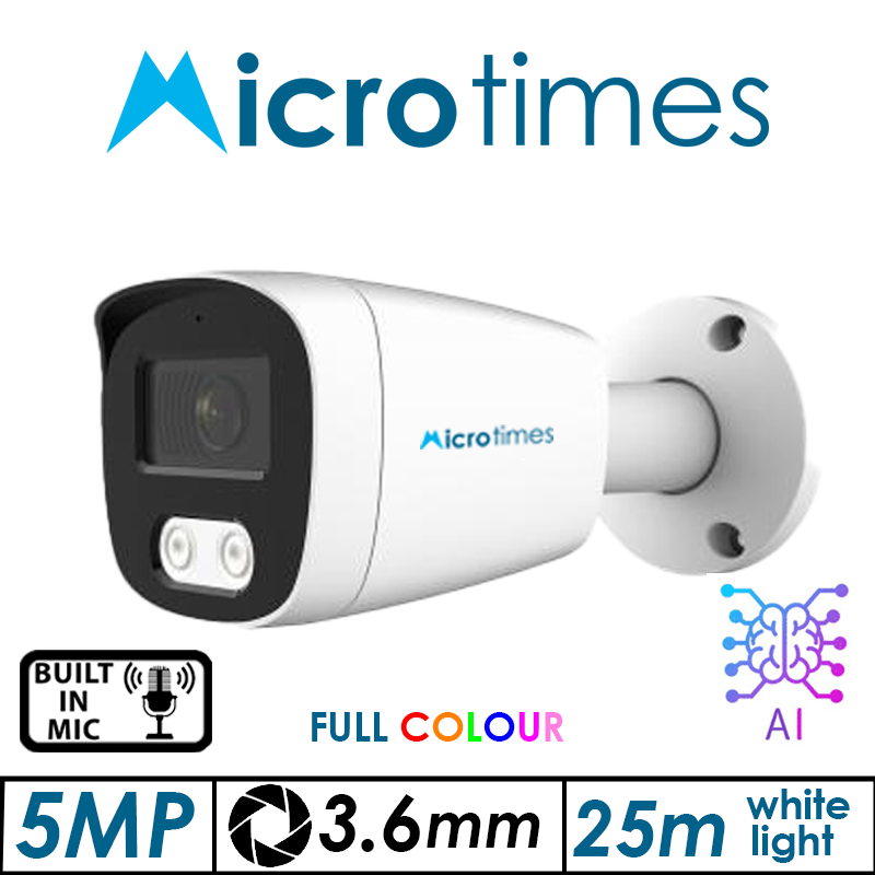 5MP MICROTIMES FULL COLOUR – HD FIXED BULLET HD NETWORK CAMERA WITH BUILT-IN MIC AND WITH DEEP LEARNING ARTIFICIAL INTELLIGENCE 3.6MM BLEXM500FCIPW