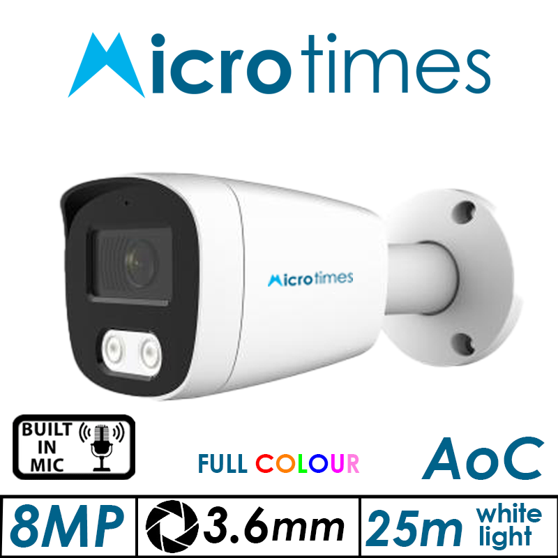 8MP MICROTIMES FULL COLOUR – HD FIXED BULLET HD ANALOGUE CAMERA WITH BUILT-IN MIC WHITE 3.6MM BLEXM800FCHDW